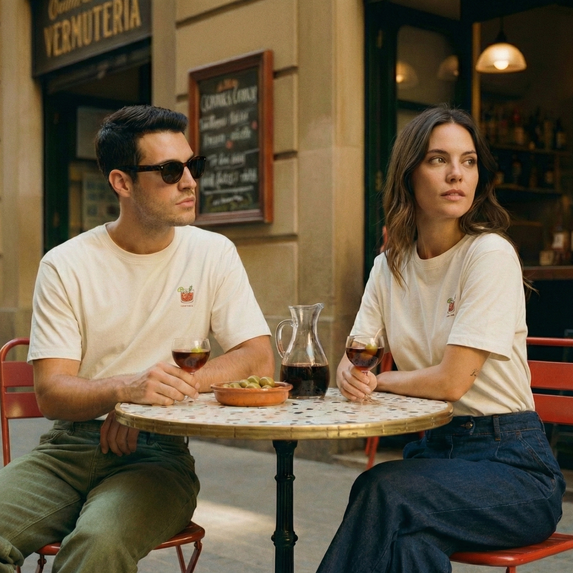 Vermut hour is a minimal city T‑shirt inspired by one of Barcelona’s most familiar rituals. In Barcelona, drinking vermut is a beloved weekend ritual: slow sips before lunch, shared with olives, conversation, and the unhurried rhythm of the city.